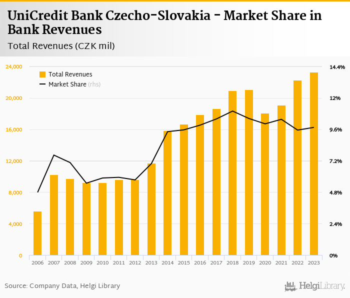 As a result, UniCredit Bank Czecho-Slovakia accounted for 9.75% of all bank revenues generated by banks in Czechia in 2023. Historically, the bank’s market share in total revenues reached an all time high of 11.0% in 2018 and an all time low of 4.79% in 2006.