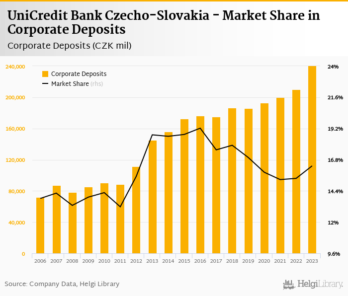UniCredit Bank Czecho-Slovakia accounted for 16.3% of all corporate deposits taken by banks in Czechia at the end of 2023. Historically, the bank’s market share in corporate deposits reached an all time high of 19.2% in 2016 and an all time low of 13.2% in 2011.