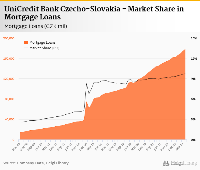 UniCredit Bank Czecho-Slovakia's mortgage loans reached CZK 178,189 mil in 4Q2024, up 2.41% compared to the previous year.