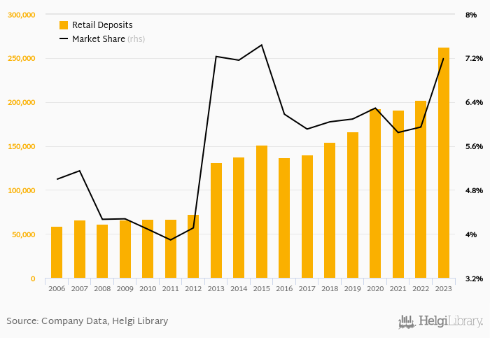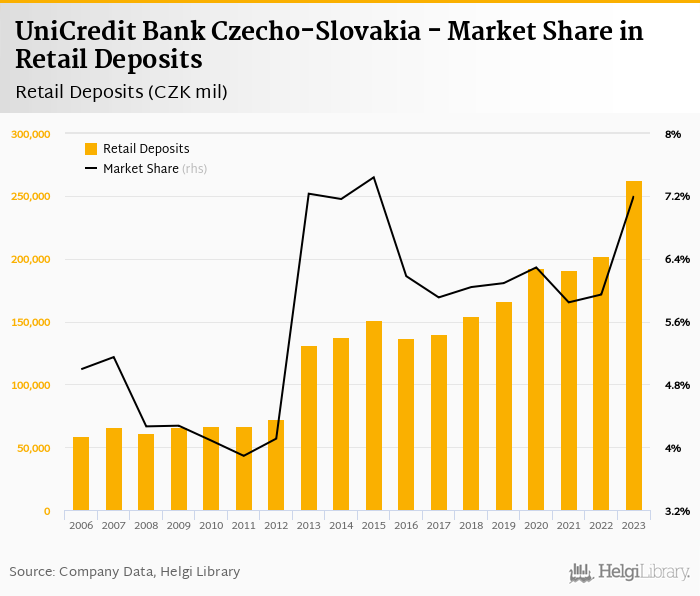 UniCredit Bank Czecho-Slovakia accounted for 7.20% of all retail deposits taken by banks in Czechia at the end of 2023. Historically, the bank’s market share in retail deposits reached an all time high of 7.44% in 2015 and an all time low of 3.89% in 2011.