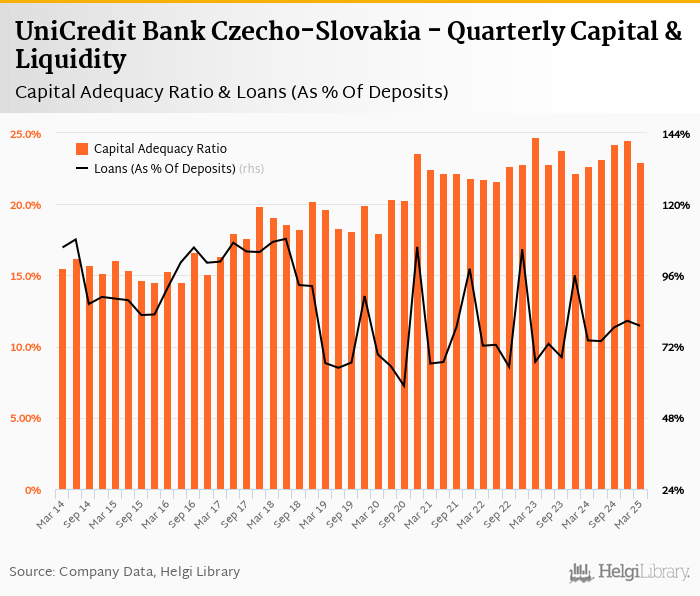 UniCredit Bank Czecho-Slovakia's capital adequacy ratio reached 23.0% at the end of first quarter of 2025, down from 24.5% when compared to the previous quarter. Historically, the bank’s capital ratio hit an all time high of 24.7% in 1Q2023 and an all time low of 14.5% in 4Q2015.
