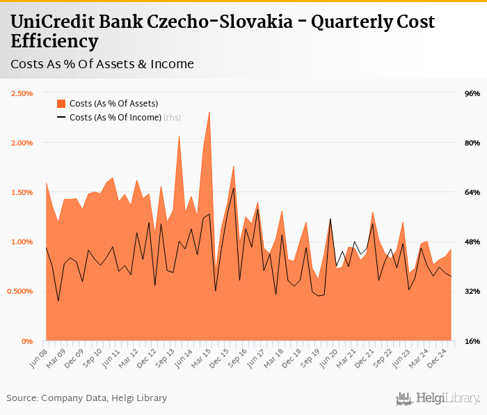 UniCredit Bank Czecho-Slovakia's cost to income ratio reached 36.7% in the first quarter of 2025, down from 37.8% when compared to the previous quarter.