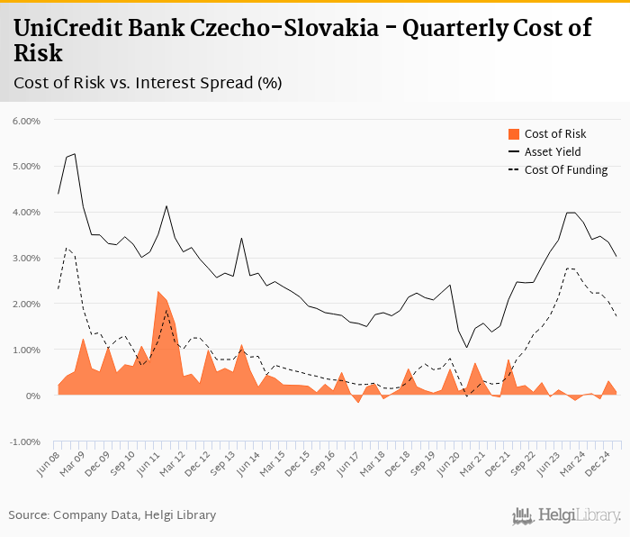 UniCredit Bank Czecho-Slovakia's Cost of Risk (loan loss provisions as % of total assets) amounted to 0.047% in the first quarter of 2025, down from 0.302% when compared to the previous quarter.