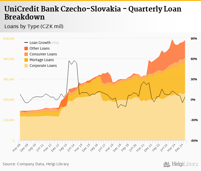 UniCredit Bank Czecho-Slovakia's loans reached CZK 586,735 mil in the first quarter of 2025, up from CZK 574,864 mil when compared to the previous quarter and up from CZK 563,091 mil when compared to the same period of last year. Historically, the bank’s loans reached an all time high of CZK 591,926 mil in 4Q2023 and an all time low of CZK 166,520 mil in 3Q2009.