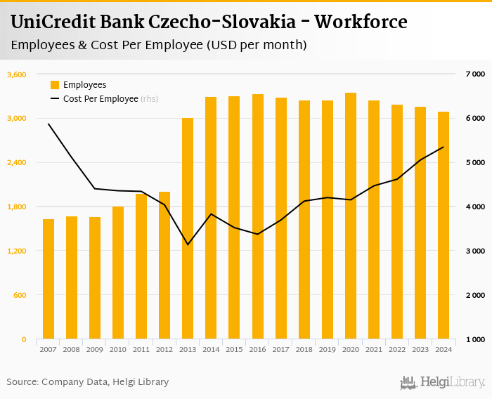 UniCredit Bank Czecho-Slovakia employed 3,090 persons in 2024, down 2.28% when compared to the previous year. Historically, the bank's workforce hit an all time high of 3,347 persons in 2020 and an all time low of 1,631 in 2007.
