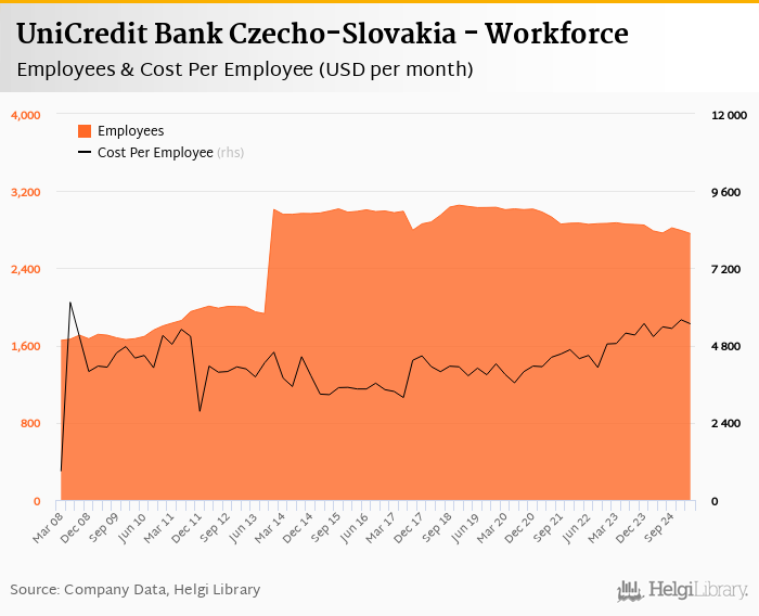 UniCredit Bank Czecho-Slovakia employed 2,760 persons in 2025-03-31, down 1.15% when compared to the previous year. Historically, the bank's workforce hit an all time high of 3,054 persons in 2018-12-31 and an all time low of 1,653 in 2008-03-31.