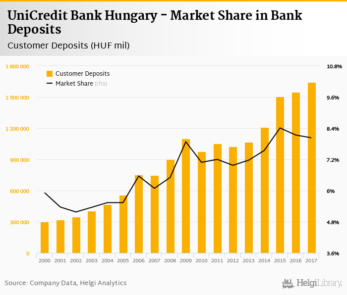 UniCredit Bank Hungary accounted for 8.03% of all customer deposits taken by banks in Hungary at the end of 2017. Historically, the bank’s market share in customer deposits reached an all time high of 8.41% in 2015 and an all time low of 5.18% in 2002.