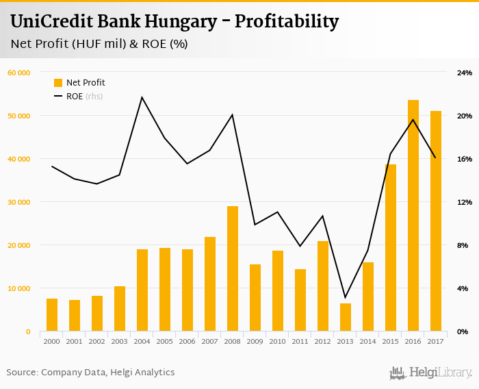 UniCredit Bank Hungary made a net profit of HUF 51,091 mil in 2017, down 4.83% compared to the previous year. This implies a return on equity of 16.0%.