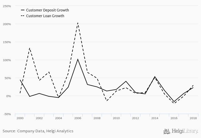 On the other hand, bank's customer deposit growth amounted to 22.8% at the end of 2018, up from 6.16% when compared to the previous year. Historically, the bank’s deposit growth reached an all time high of 101% in 2006 and an all time low of -16.4% in 2016. In the last decade, the average annual loan growth amounted to 15.1%.