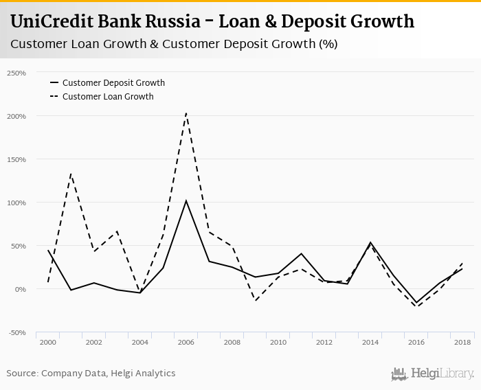 UniCredit Bank Russia's customer loan growth reached 29.1% in 2018, up from -1.25% compared to the previous year. Historically, the bank’s loans growth reached an all time high of 203% in 2006 and an all time low of -21.9% in 2016. In the last decade, the average annual loan growth amounted to 8.01%.