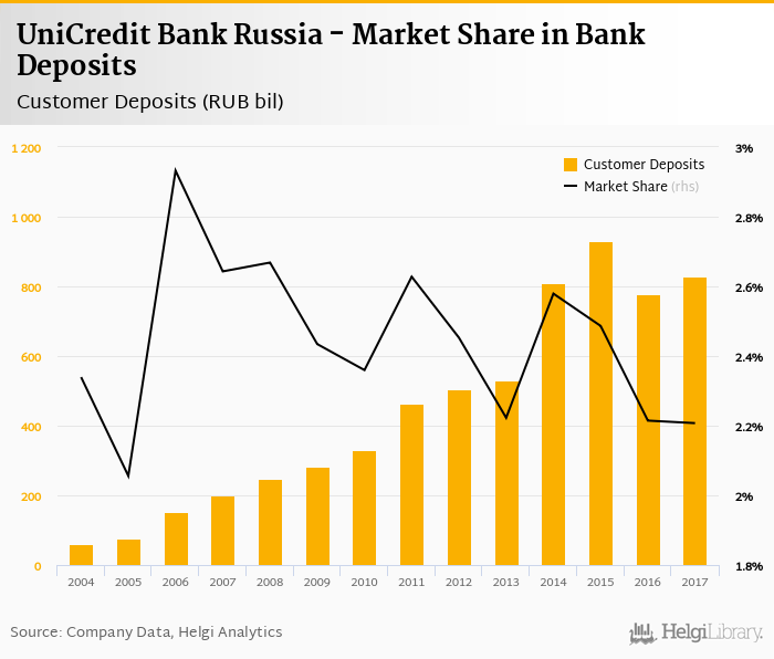 UniCredit Bank Russia's customer deposits reached RUB 827 bil in 2017, up 6.16% compared to the previous year.