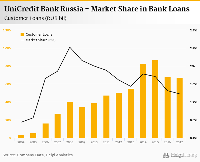 UniCredit Bank Russia's customer loans reached RUB 669 bil in 2017, down 1.25% compared to the previous year.