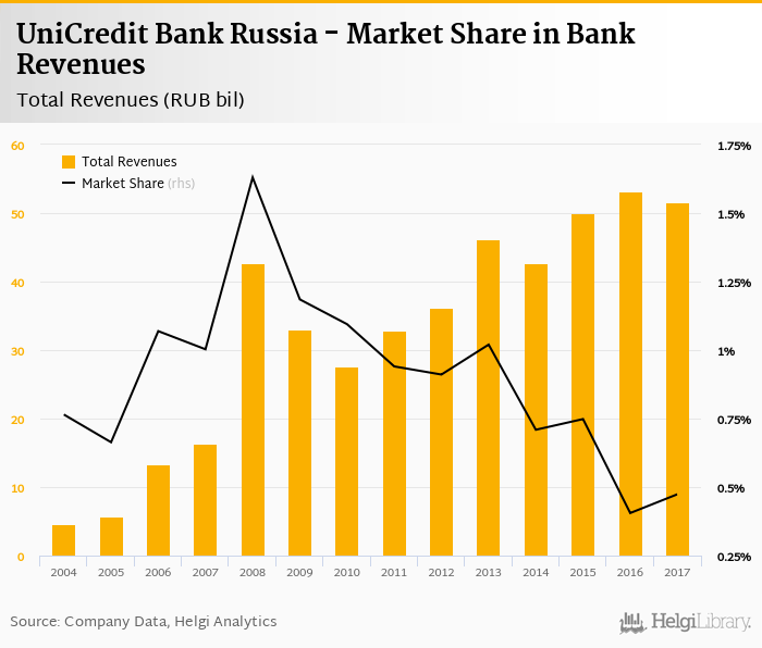 As a result, UniCredit Bank Russia accounted for 0.474% of all bank revenues generated by banks in Russia in 2017. Historically, the bank’s market share in total revenues reached an all time high of 1.63% in 2008 and an all time low of 0.405% in 2016.