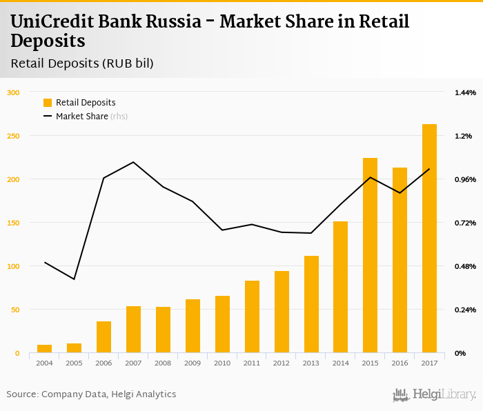 UniCredit Bank Russia accounted for 1.01% of all retail deposits taken by banks in Russia at the end of 2017. Historically, the bank’s market share in retail deposits reached an all time high of 1.05% in 2007 and an all time low of 0.404% in 2005.