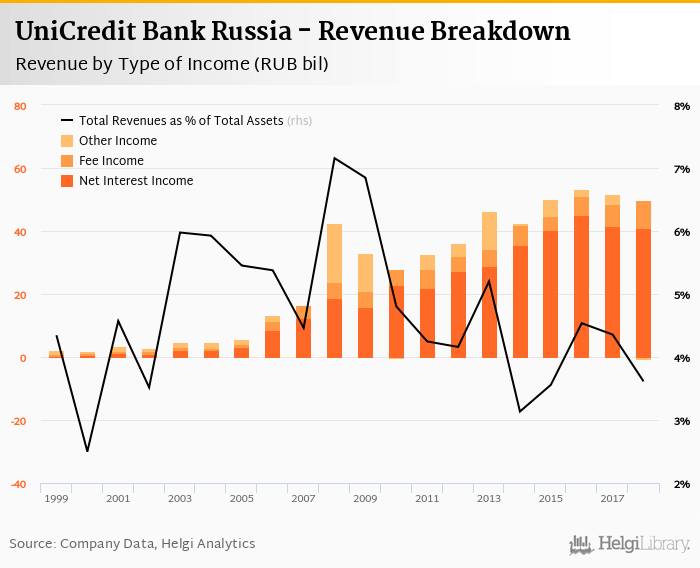 Comparing UniCredit Bank Russia with its closest peers, Sberbank generated total revenues of 6.20% of assets in 2018, VTB Bank operated with 4.10% revenue margin and Alfa Bank produced total income worth 6.50% of assets.