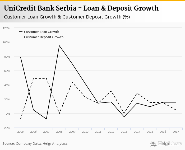 UniCredit Bank Serbia's customer loan growth reached 15.5% in 2017, down from 15.5% compared to the previous year. Historically, the bank’s loans growth reached an all time high of 94.9% in 2008 and an all time low of -7.99% in 2007. In the last decade, the average annual loan growth amounted to 25.6%.