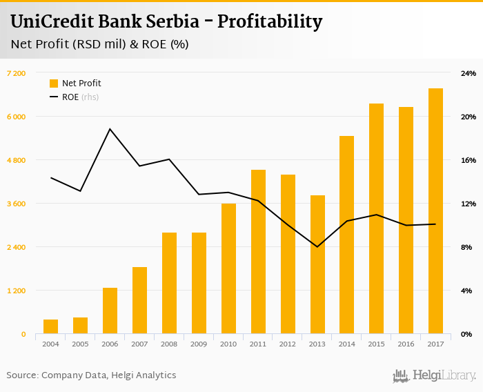 UniCredit Bank Serbia made a net profit of RSD 6,782 mil in 2017, up 8.11% compared to the previous year. This implies a return on equity of 10.0%.