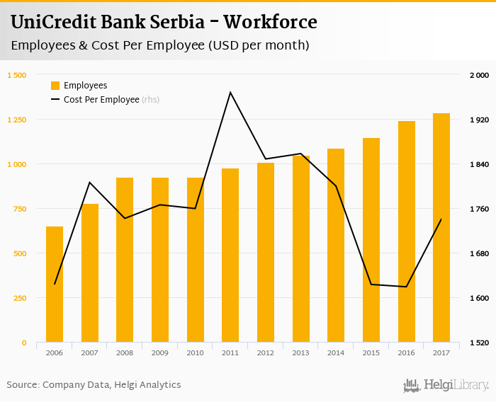UniCredit Bank Serbia employed 1,286 persons in 2017, up 3.63% when compared to the previous year. Historically, the bank's workforce hit an all time high of 1,286 persons in 2017 and an all time low of 651 in 2006.