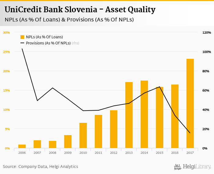 Comparing UniCredit Bank Slovenia with its closest peers, Nova Ljubljanska banka operated at the end of 2017 with NPL ratio of 11.0% and provision coverage of 76.7%, NKBM Group with 12.0% and 117% respectively and SKB Banka had 6.44% of bad loans covered with 82.9% by provisions at the end of 2017.