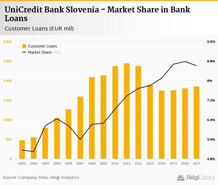 UniCredit Bank Slovenia accounted for 8.60% of all customer loans issued in Slovenia at the end of 2017. Historically, the bank’s market share in customer loans reached an all time high of 8.77% in 2016 and an all time low of 5.08% in 2003.