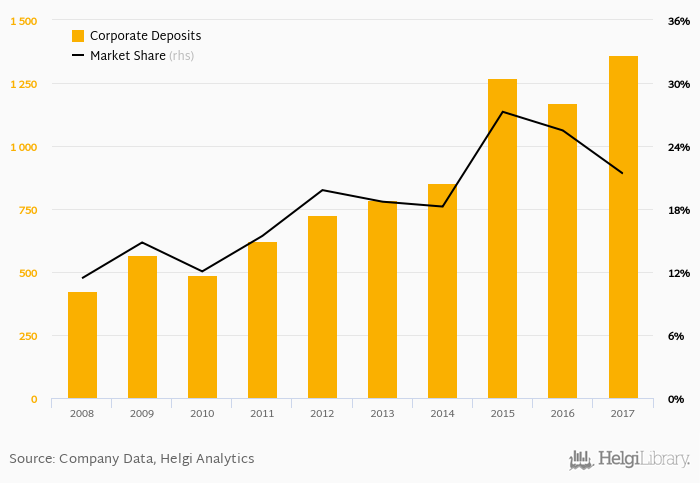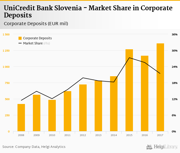 UniCredit Bank Slovenia accounted for 21.4% of all corporate deposits taken by banks in Slovenia at the end of 2017. Historically, the bank’s market share in corporate deposits reached an all time high of 27.3% in 2015 and an all time low of 11.4% in 2008.