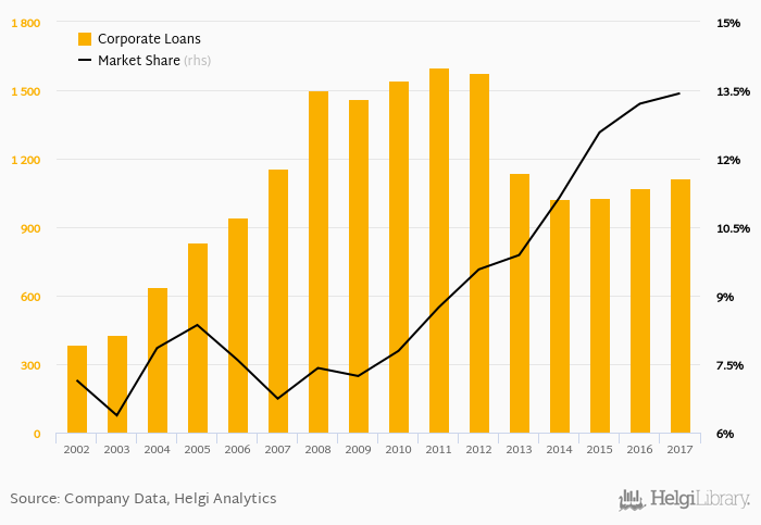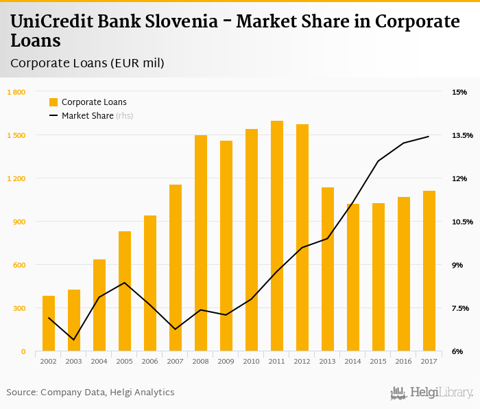 UniCredit Bank Slovenia accounted for 13.4% of all corporate loans issued in Slovenia at the end of 2017. Historically, the bank’s market share in corporate loans reached an all time high of 13.4% in 2017 and an all time low of 6.38% in 2003.