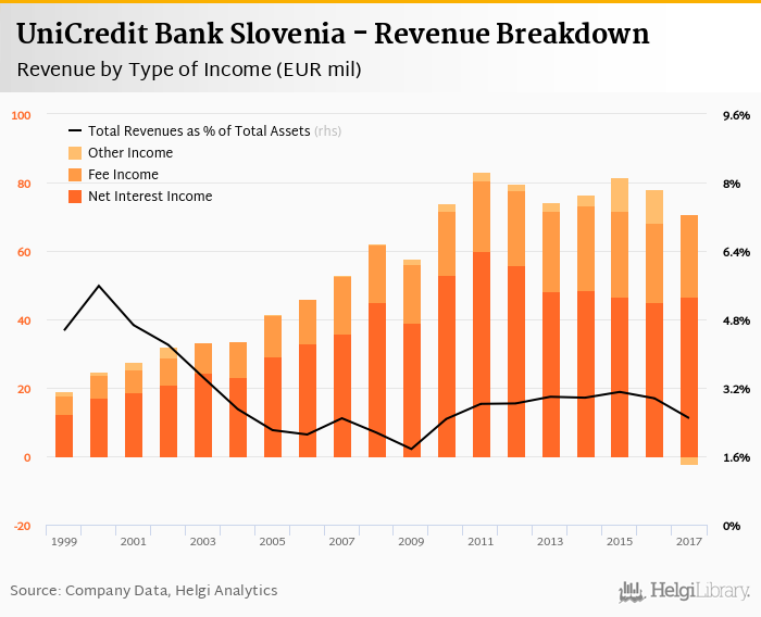 Comparing UniCredit Bank Slovenia with its closest peers, Nova Ljubljanska banka generated total revenues of 3.99% of assets in 2017, NKBM Group operated with 2.90% revenue margin and SKB Banka produced total income worth 3.49% of assets.
