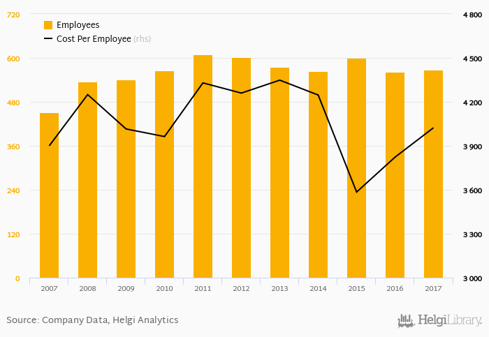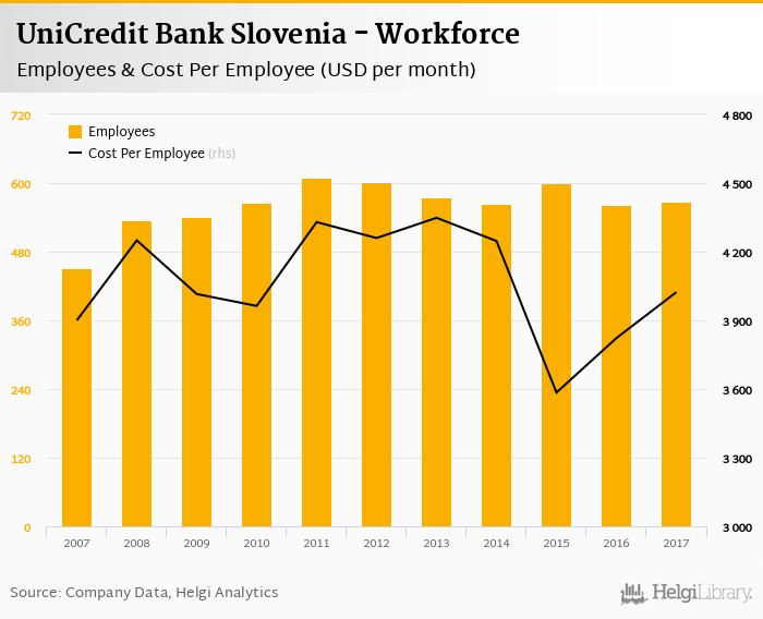 UniCredit Bank Slovenia employed 568 persons in 2017, up 1.25% when compared to the previous year. Historically, the bank's workforce hit an all time high of 609 persons in 2011 and an all time low of 451 in 2007.