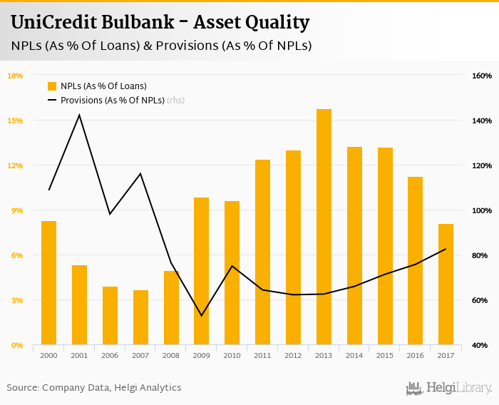 UniCredit Bulbank's non-performing loans reached 8.10% of total loans at the end of 2017, down from 11.2% compared to the previous year. Historically, the NPL ratio hit an all time high of 15.8% in 2013 and an all time low of 3.66% in 2007.