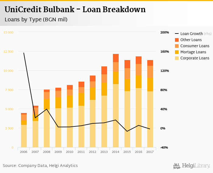 UniCredit Bulbank's loans reached BGN 11,391 mil in the 2017, down from BGN 11,882 mil compared to the previous year. Historically, the bank’s loans reached an all time high of BGN 12,174 mil in 2014 and an all time low of BGN 4,468 mil in 2006.