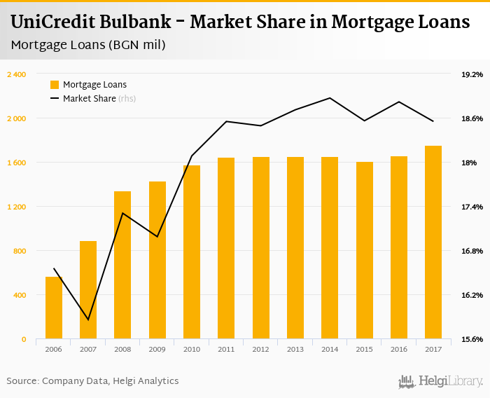 UniCredit Bulbank accounted for 18.5% of all mortgage loans issued in Bulgaria at the end of 2017. Historically, the bank’s market share in mortgage loans reached an all time high of 18.9% in 2014 and an all time low of 15.9% in 2007.