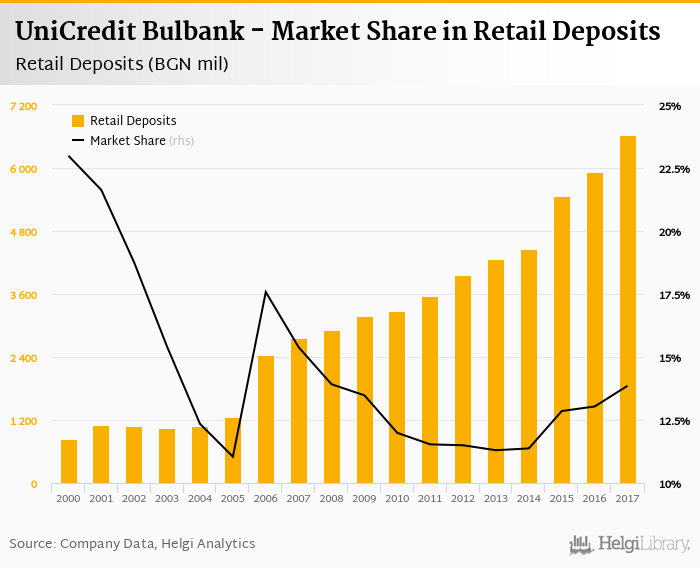 UniCredit Bulbank accounted for 13.9% of all retail deposits taken by banks in Bulgaria at the end of 2017. Historically, the bank’s market share in retail deposits reached an all time high of 23.0% in 2000 and an all time low of 11.0% in 2005.