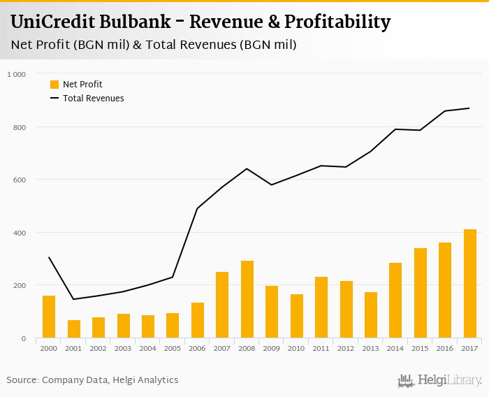UniCredit Bulbank made a net profit of BGN 412 mil under revenues of BGN 868 mil in 2017, up 14.1% and 1.22% respectively compared to the previous year.