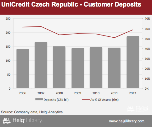 UniCredit CR is the fourth largest bank in the Czech Republic by assets, with a market share of nearly 7%. The current bank is a result of the merger between UniCredit and two other banks, Živnostenská banka and HVB Bank. Client deposits reached CZK 186 bil at the end of 2012. Although not as dominant source as at the three largest Czech banks, the deposits are still the single biggest part of the bank's funding accounting for 58% of assets