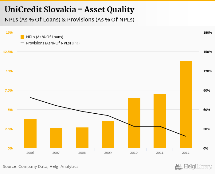 UniCredit Slovakia's non-performing loans reached 11.4% of total loans at the end of 2012, up from 7.05% compared to the previous year. Historically, the NPL ratio hit an all time high of 11.4% in 2012 and an all time low of 2.67% in 2007.