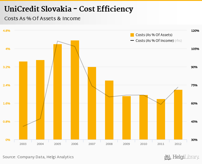 UniCredit Slovakia's cost to income ratio reached 73.2% in 2012, up from 58.9% compared to the previous year.