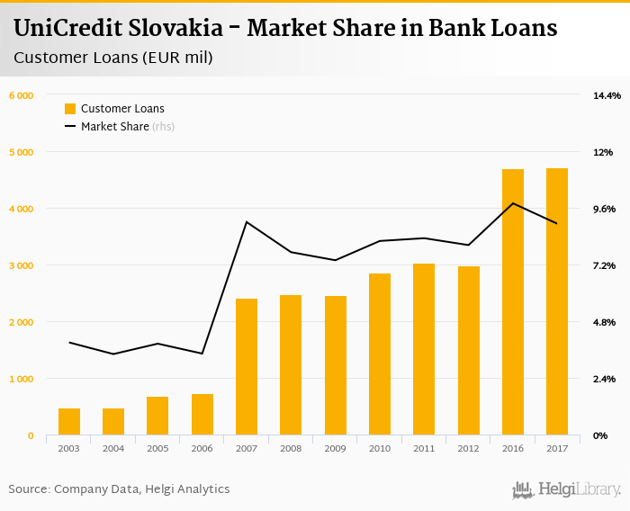 UniCredit Slovakia's customer loans reached EUR 4,711 mil in 2017, up 0.430% compared to the previous year.