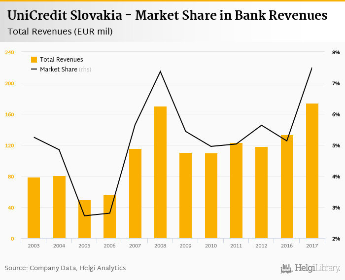 As a result, UniCredit Slovakia accounted for 7.50% of all bank revenues generated by banks in Slovakia in 2017. Historically, the bank’s market share in total revenues reached an all time high of 7.50% in 2017 and an all time low of 2.72% in 2005.