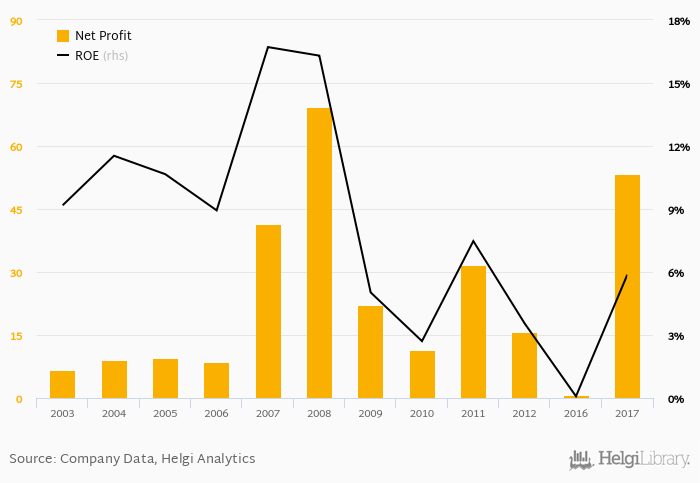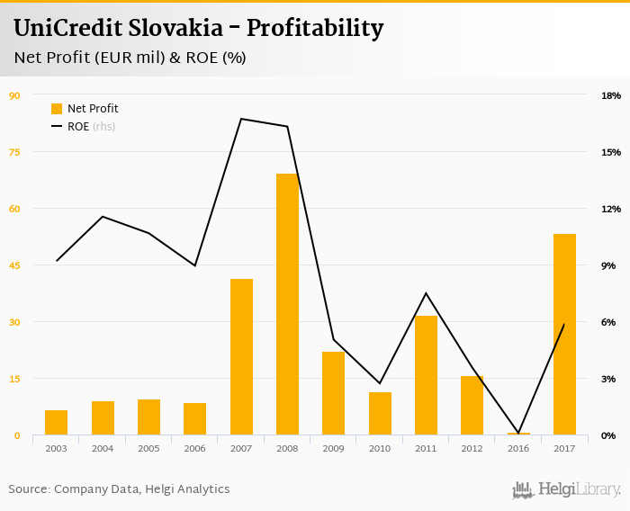 UniCredit Slovakia made a net profit of EUR 53.3 mil in 2017, up 6,454% compared to the previous year. This implies a return on equity of 5.87%.