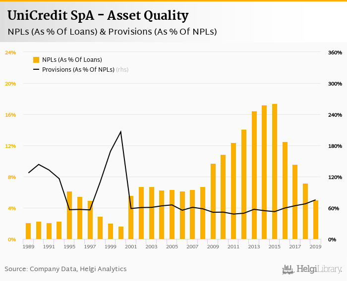 UniCredit SpA's non-performing loans reached 5.04% of total loans at the end of 2019, down from 7.19% compared to the previous year. Historically, the NPL ratio hit an all time high of 17.4% in 2015 and an all time low of 1.68% in 2000.