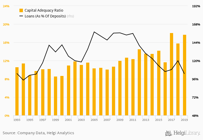 Bank's loan to deposit ratio reached 103% at the end of 2019, down from 120% when compared to the previous year. Some 10 years ago, loan to deposit ratio of the bank amounted to 156%.