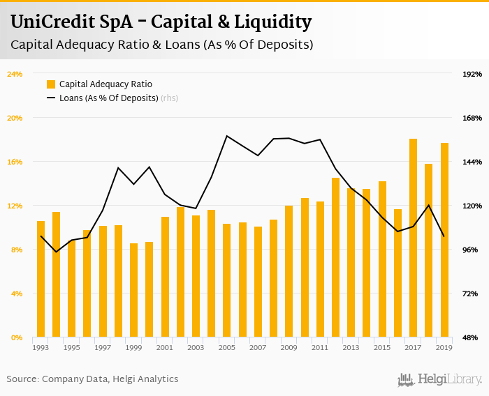 UniCredit SpA's capital adequacy ratio reached 17.7% at the end of 2019, up from 15.8% compared to the previous year. Historically, the bank’s capital ratio hit an all time high of 18.1% in 2017 and an all time low of 8.55% in 1999.