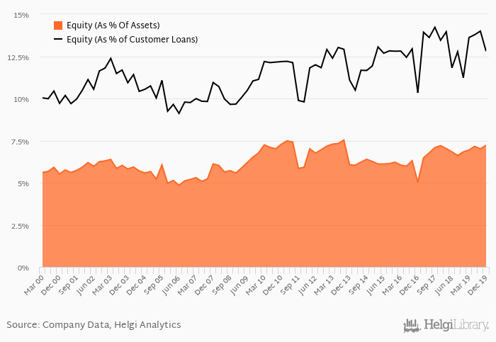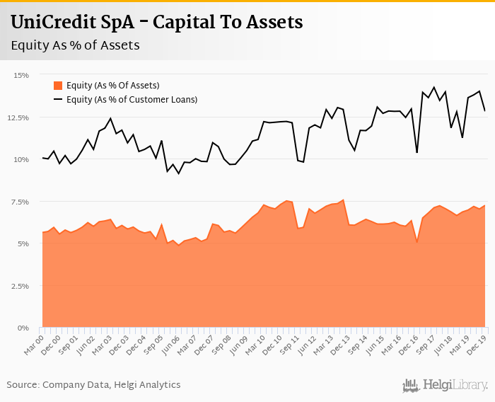 UniCredit SpA's Equity reached of total assets in the 4Q2019, up from 11.8% for the previous year. As a share of net customer loans, the ratio amounted to at the end of the fourth quarter of 2019.