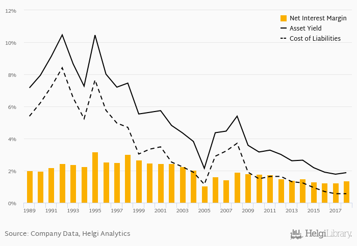 Historically, the bank’s net interest margin reached an all time high of 3.17% in 1995 and an all time low of 1.06% in 2005. The average margin in the last five years amounted to 1.33%.