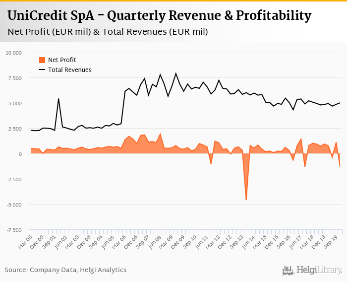 UniCredit SpA made a net profit of EUR -1,338 mil under revenues of EUR 4,999 mil in the fourth quarter of 2019, down 243% and up 3.2% respectively when compared to the same period last year.