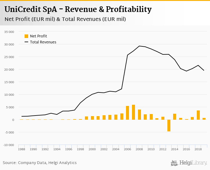 UniCredit SpA made a net profit of EUR 684 mil under revenues of EUR 19,430 mil in 2019, up -81.432450983318% and -9.7139936339769% respectively compared to the previous year.
