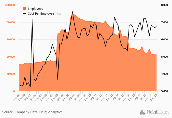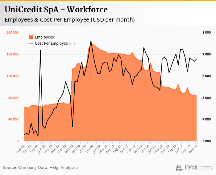 UniCredit SpA employed 84,245 persons in 2019-12-31, down 0.481% when compared to the previous year. Historically, the bank's workforce hit an all time high of 177,571 persons in 2008-06-30 and an all time low of 61,271 in 2000-09-30.