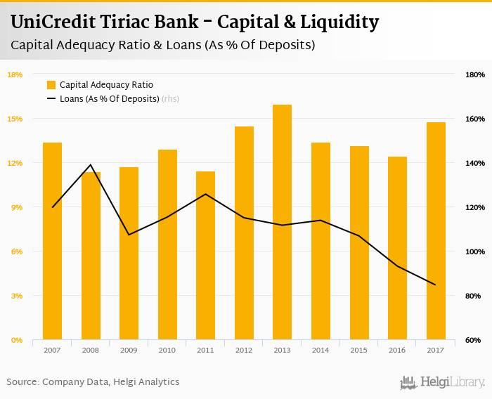 UniCredit Tiriac Bank's capital adequacy ratio reached 14.8% at the end of 2017, up from 12.4% compared to the previous year. Historically, the bank’s capital ratio hit an all time high of 15.9% in 2013 and an all time low of 11.4% in 2008.