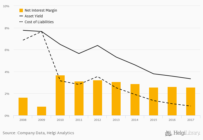 Average asset yield was 3.34% in 2017, down from 3.58% when compared to previous year. On the other hand, cost of funding amounted to 0.851% in 2017, down from 1.07%.