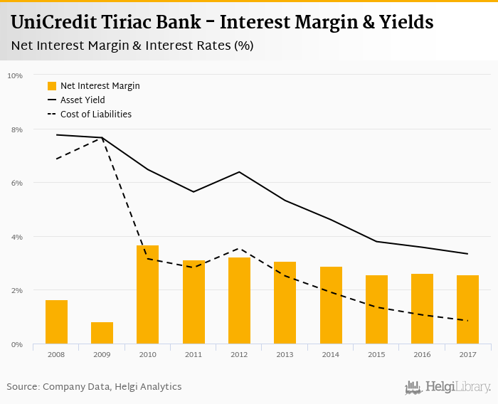 UniCredit Tiriac Bank's net interest margin amounted to 2.56% in 2017, down from 2.62% compared to the previous year.